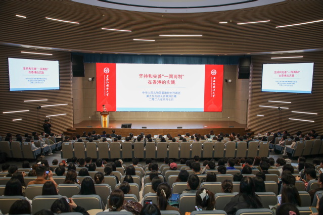 In her lecture, Lam gave a systematic overview of Hong Kong’s history, the constitutional order of the HKSAR, and the constitutional status of the Chief Executive. Drawing on developments since Hong Kong’s return to the Motherland, especially in the new era, she explained the practical significance of upholding and improving the policy of “One Country, Two Systems.” She also stated that upholding and improving the principle of one country, two systems is an undertaking essential to ensuring Hong Kong's long-term prosperity and stability. She stressed that Hong Kong will better leverage its distinctive advantages of enjoying strong support of the Motherland and being closely connected to the world. She added that Hong Kong will make greater contributions to building a strong China and advancing China’s national rejuvenation. Following the lecture, Lam took part in an interactive session with faculty and students.