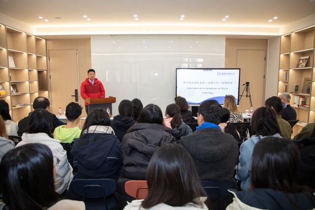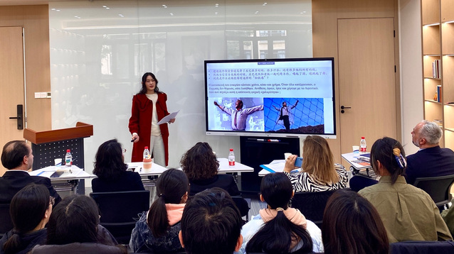 主题活动在希腊文化中心举行。西方语系副主任杨明(主持工作)在欢迎辞中表示,卡赞扎基斯作品饱含生命力与能量,跨越语言界限,触及人类共同的精神家园。柯思博总领事结合阅读体会,强调了人文交流对中希关系的作用,称赞其是连接两国人民心灵的独特桥梁。文友会名誉主席斯塔西纳基斯在致辞中缅怀希腊语资深翻译李成贵先生,勉励师生通过中希文学作品互译,进一步深化两国文化交流。